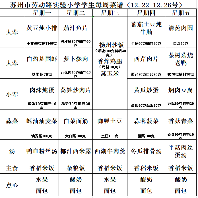 苏州市劳动路实验小学第18周菜谱